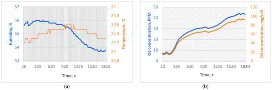 (a) Temperature and humidity sterilization conditions for SG2, and (b) ozone concentrations of the sterilization process for SG2.