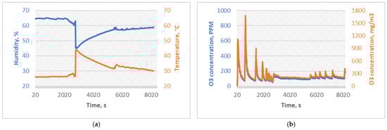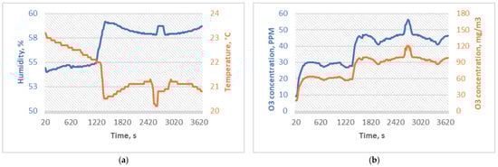 The SG3 experiment was designed to increase the ozone concentration to the highest safely attainable ozone concentration with available equipment. The sterilization duration was doubled compared to the SG2, and the ozone concentration average was 121.18 ppm (256.12 mg/m3), with a peak value of 795 ppm. Since a powerful 100 W ozone generator was used inside a sterilization chamber, temperature was a limitation of this experiment to achieve even higher concentrations. PID regulation was programmed into a microcontroller with a set 40 °C temperature and a 180 ppm ozone concentration limit switch. The time between the ozone sensor and data readings was set to 20 s. To achieve a homogenous mixture of air and ozone inside a chamber and to avoid the influence of density differences between air and ozone, a 100 mm radial fan with a 0.6 m3/h flow rate was used at an outlet of the corona discharge ozone generator. SG3 experimental conditions are shown in Figure 5.