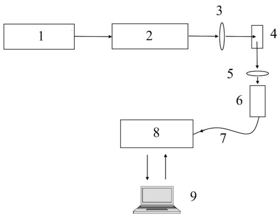 A schematic representation of the LIFs system. The components of the system include: (1) pulse width modulator module, (2) continuous wave laser, (3) lens, (4) sample, (5) laser blocking lens, (6) light gathering optics, (7) optical fiber, (8) spectrometer, and (9) data acquisition and control.
