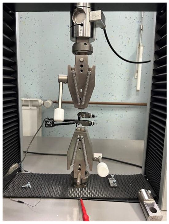 A total of four specimens from each SG were used to obtain tensile properties and to detect ozone-influenced changes in material properties. The fused deposition modeling technique, also known as fused filament fabrication, is an additive manufacturing process within the realm of material extrusion in the 3D printing process; therefore, it builds parts layer by layer by selectively extruding material through a programmed path, leaving a rough surface finish caused by seams between extruder layers. To avoid the influence of roughness on the obtained tensile results, each specimen was sanded and water-polished from both sides; thereafter, the nominal cross-section was bright, and the thickness of all specimens was 4.5 and 1.2 mm, respectively. Tensile strength was measured in the Galdabini Quasar 5 testing machine, Galdabini, Cardano al Campo, Italy, according to ISO 527-1 [22] and ISO 527-2 standards. A loading cell with a maximum capacity of 500 N and +0.5% accuracy was used. Elongation was measured by an INSTRON extensometer, Labsys d.o.o., Ljubljana, Slovenia, with a 12.5 mm initial length and +/−5 mm displacement with 0.1% accuracy. Tests were performed in stroke control with constant 1mm/min velocity at 23.5 °C room temperature and 48% humidity. The setup for testing with proportional grips is shown in Figure 8. During the test, a force-extension plot was recorded for each specimen.
