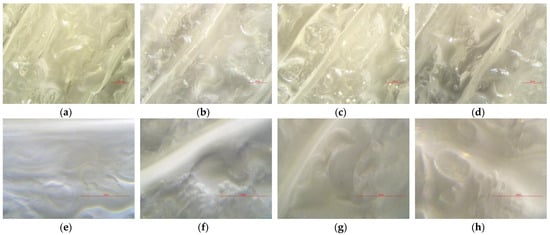 Specimens surface under 10× and 40× magnification: (a) SG0 under 10× magnification, (b) SG1 under 10× magnification, (c) SG2 under 10× magnification, (d) SG3 under 10× magnification, (e) SG0 under 40× magnification, (f) SG1 under 40× magnification, (g) SG2 under 40× magnification, and (h) SG3 under 40× magnification.