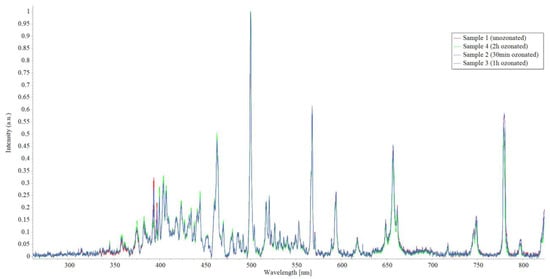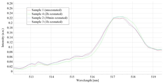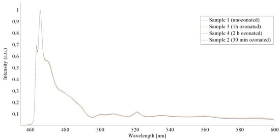 All the samples show the highest fluorescence band at 466 nm, with characteristic shoulders at 464 and 470 nm. Also, all the samples show a band at 521.5 nm that corresponds to Stokes light scattering assigned to C–H and O–CH3 band vibrations [23,24]. As shown in Figure 13, there are no detectable changes in the LIF spectrum of the samples that would suggest ozone-caused degradation.