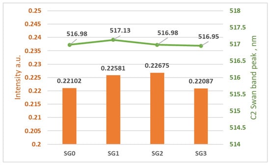 The optical emission spectra shown in Figure 10 represent emission spectra averaging over 1000 ms intervals and normalized on the highest peak value of all 4 samples of the unsterilized and sterilized materials during different time intervals. In optical emission spectrometry, the atomic emission of a specific element is usually connected with a single line at a specific wavelength, and molecular bands relate to the vibrational and rotational states of ablated diatomic species, for example, the C2 molecule. In plasma-forming optical-emission spectrometry methods, the bands (C2 molecules), also called carbon dimers, are usually shown in the range of 465–590 nm. The Swan band is located at a wavelength of 516.5 nm [17], and there is a high correlation between the analysis data of polymer degradation in a corrosive atmosphere obtained by FTIR analysis and that obtained using the C2 Swan band from plasma forming methods such as LIBS. The C2 Swan bands of all SGs are shown in Figure 11.