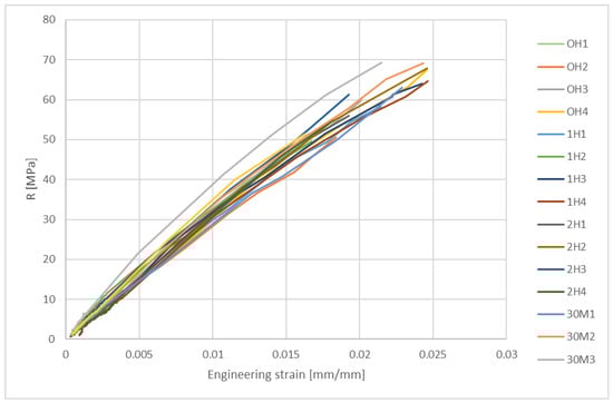 Mechanical properties are obtained and analyzed according to standards ISO 527-1 [22] and ISO 527-2 [13]. Results for all 16 specimens are shown in Figure 14 by taking into account the cross-section of each tested specimen after the polishing process.