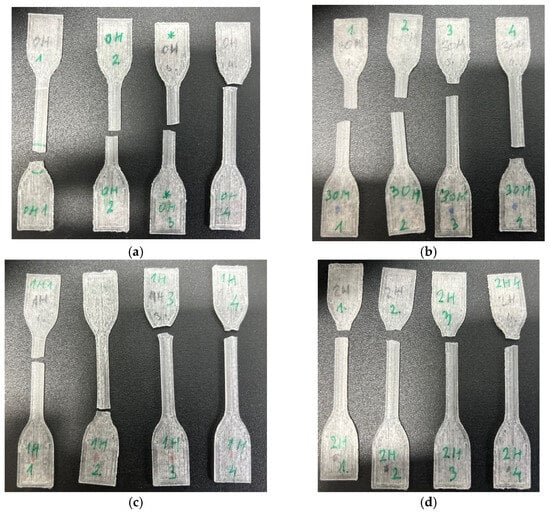 Figure 14 results suggest that all specimens exhibit brittle material properties, breaking without yielding at low strain. Table 2 shows the averaged values of Young’s modulus, tensile strength, and elongation, according to the ISO 527-1 standard [22] for each SG, respectively. Furthermore, the 0H3 specimen in Figure 14 shows a steeper stress–strain curve compared to the other specimens. All of the specimens were stored in an air-tight container separately after the ozone sterilization, and a higher Young modulus of a 0H3 (designated with a “*” mark under Figure 15) specimen could indicate container failure according to Radojičić et al. [25] or an oscillation in 3D printing bed temperature according to Abdel-Wahab et al. [26].