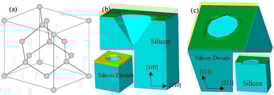 (a) The lattice structure of silicon. (b) Self-stopping corrosion simulation of (100) silicon wafers in alkaline solution. (c) Self-stopping corrosion simulation of (111) silicon wafers in alkaline solution.