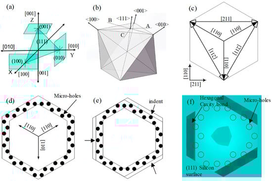 Figure 1c demonstrates that on the (111) wafer, initially etching the window downward for a certain distance and subsequently etching it with an alkaline solution results in a hexagonal window structure. This is achieved by lateral etching around the etching holes with minimal or no etching on the wafer’s (111) crystal planes. The six side edges correspond to the corrosion-stopping surfaces, identified as (111) surfaces. These, in conjunction with the upper and lower surfaces of the wafer, compose an octahedral structure with a minimum of (111) surfaces, as depicted in Figure 2a. If the depth of the etched cavity structure is significant, the octahedral structure can be clearly etched out, and the corresponding shape of the cavity’s upper surface will gradually transition from hexagonal to triangular. When the height of the corroded cavity is small, the resulting cavity structure closely resembles a central portion intercepted at the center of the octahedron formed by the (111) planes, thereby enabling the acquisition of a structure near an orthohexagonal shape. The position of the silicon’s (111) crystalline plane is depicted in Figure 2b. As the cavity height diminishes, the upper surface of the cavity approaches a regular hexagon. The MIS process leverages this MEMS wet etching technique, commencing with the etching of micro-holes on the surface, followed by sidewall protection after etching to a defined depth. Subsequently, lateral etching using a TMAH solution is carried out to form through-hole interconnections and release the designed cavity thin-film structure.