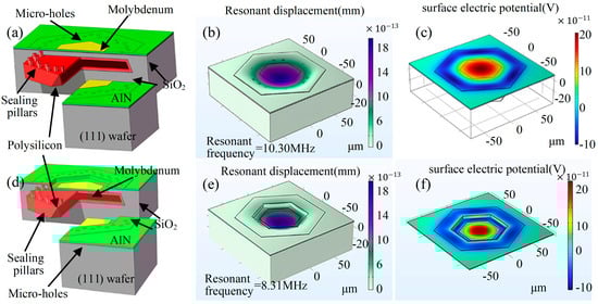 The designed PMUT structure is depicted in Figure 3a,d, This structure relies on the conformal nature of low-pressure chemical vapor deposition (LPCVD) polysilicon, which is utilized as the cavity sealing layer material. Molybdenum was selected as the metal electrode due to its high sonic velocity characteristics. Aluminum nitride film was employed as the piezoelectric material due to its high piezoelectric coefficient and low dielectric constant properties. Figure 3a illustrates that the PMUT movable diaphragm structure created through the MIS process comprises a monocrystalline silicon diaphragm and a polycrystalline silicon diaphragm.