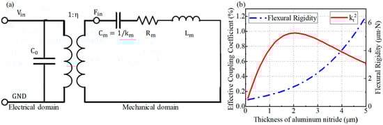 (a) Schematic of BVD model of PMUT. (b) The influence of changing thickness of aluminum nitride layer on electromechanical coupling and flexural rigidity of MIS-process PMUT with etched diaphragm.