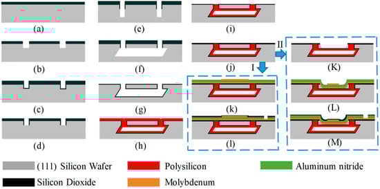 The fabrication process of MIS-process PMUT, (a–l) illustrates the manufacturing process of flat diaphragm PMUT, (a–j) and (K–M) illustrates the manufacturing process of etched diaphragm PMUT. Arrows with I and II indicate the difference in manufacturing between the flat diaphragm PMUT and the etched diaphragm PMUT after step (j).