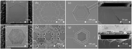 Figure 6 shows the SEM images of the flat diaphragm structure and the etched diaphragm structure PMUTs. The SEM images of the flat diaphragm PMUT array, along with the upper electrode interconnection of the array, and the SEM images of a single PMUT device as well as the section view of the device and an etched diaphragm PMUT array are shown in Figure 6a–d and Figure 6e–h, respectively. It is observed that there is an obvious rollover phenomenon at the edge portion of the metal alignment of the etched diaphragm structure, a result of the lift-off process on the high step, and it can be circumvented by adopting the dry etching process. Therefore, considering the process yield, flat diaphragm MIS-process PMUT devices are more conducive to arrayed practical applications and mass production.