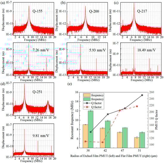 (a) The test results of frequency response (upper) and displacement sensitivity (lower) of a PMUT with a radius of 47 μm (flat diaphragm). (b) The test results of frequency response (upper) and displacement sensitivity (lower) of a PMUT with a radius of 47 μm (etched diaphragm. (c) The test results of frequency response (upper) and displacement sensitivity (lower) of a PMUT with a radius of 51 μm (flat diaphragm). (d) The test results of frequency response (upper) and displacement sensitivity (lower) of a PMUT with a radius of 51 μm (etched diaphragm. (e) Comparison of Q value and displacement sensitivity between flat film and etched film PMUT.