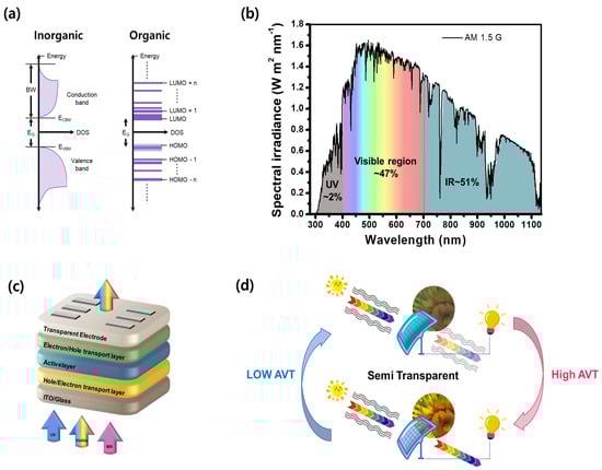 (a) Pictorial illustration of the energy level of inorganic and organic semiconductors; (b) solar emission spectrum and the energy fraction in the UV, visible, and infrared regions; (c) illustration of a visibly transparent (UV−NIR-selective) ST-OSC device; and (d) schematic illustration of an ST-OSC module with low and high average visible transmittance (AVT).