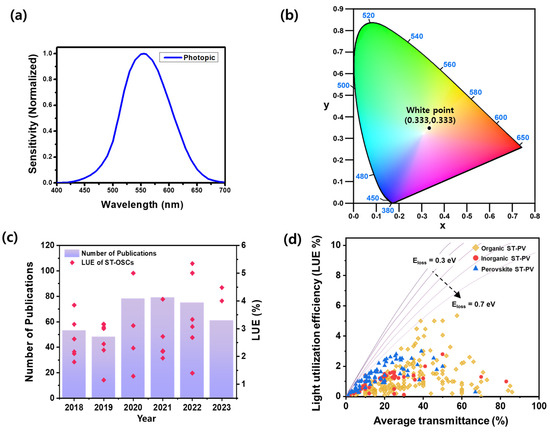 (a) Photopic spectral response of the human eye; (b) Commission Internationale de l’Eclairage (CIE) 1931 chromaticity diagram; (c) progress in the LUE and publication numbers of ST-OSCs since 2018. A number of publications were retrieved from the Web of Science (keyword: ST-OSCs), and the LUE values are shown in Table 1, Table 2 and Table 3. (d) Comparison of selected results of LUE and AVT for the organic, inorganic, and perovskite solar cells.