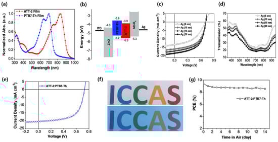 (a) Absorption spectra of PTB7-Th and ATT-2 in thin films; (b) energy level diagrams; (c) J–V curves; (d) transmission spectra of the devices; (e) J–V curve of the OSC device with active area of 0.1 cm2; (f) photographs of letters without and with the semitransparent device; and (g) the stability of OSC device efficiencies in ambient conditions. Reproduced with permission from [57]. Copyright 2017, John Wiley and Sons.