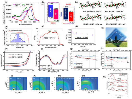 (a) Absorption spectra; (b) molecular energy levels; (c) DFT calculation of energy levels of donors and acceptors; (d) J–V curve and histogram (inset) of the PCE measurements for PBDB-T-SF:IT-4F-based OSCs; (e) EQE curve; and (f) storage stability of the PBDB-T-SF:IT-4F-based OSCs. Adapted with permission from [68]. Copyright 2017, American Chemical Society. (g) Photograph; (h) J–V curve and (i) transmittance spectra of PBN-S:IT-4F-based ST-OSCs. (j) Unencapsulated devices with a conventional configuration of glass/ITO/PEDOT:PSS/PBN-S:IT-4F/ZnO/Al stored in a nitrogen-filled glove-box; (k) unencapsulated devices with an inverted configuration of glass/ITO/ZnO/PBN-S:IT-4F/MoO3/Al stored in air; 2D-GIWAXS patterns (i–o); and (p) in-plane and out-of-plane of the neat film and the PBN-S:IT-4F. Reproduced with permission [69]. Copyright 2019, Royal Society of Chemistry.
