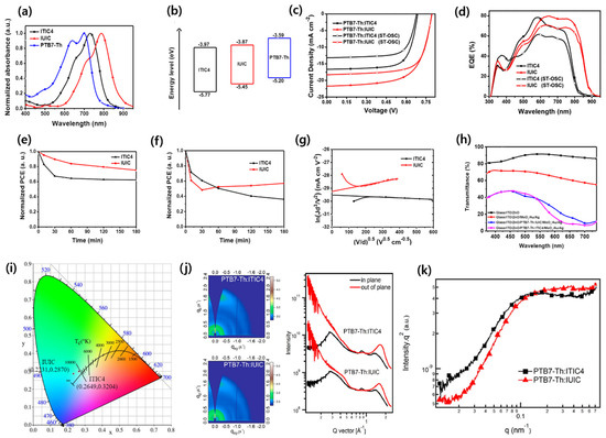 (a) Thin-film absorption spectra; (b) energy levels of PTB7-Th, IUIC, and ITIC4; (c) J–V curves; (d) EQE spectra of optimized OSC and ST-OSC as-cast devices based on PTB7-Th:ITIC4 and PTB7-Th:IUIC; (e) stability of the OSC devices based on PTB7-Th:IUIC and PTB7-Th:ITIC4 under AM 1.5G illumination at 100 mW cm−2 and (f) under heating at 100 °C. (g) J–V characteristics in dark for electron-only devices based on IUIC and ITIC4; (h) visible transmission spectra of with PTB7-Th:IUIC and PTB7-Th:ITIC4 with and without active layer, and (i) CIE 1931 color coordinate diagram of IUIC and ITIC4. (j) 2D GIWAXS patterns and scattering profiles of in-plane and out-of-plane for PTB7-Th:IUIC and PTB7-Th:ITIC4/IT-4F blended films; (k) R-SoXS profiles in log scale for PTB7-Th:IUIC and PTB7-Th:ITIC4 blended films. Reproduced with permission [80]. Copyright 2018, American Chemical Society.