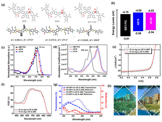 (a) Molecular geometry calculated by DFT and torsional angles (θ) between the flanking thiophene and the IDT core. The d is the S···S distance (A078 and A134) or C···S distance of (IDT-T-FIC); (b) energy level diagram of SBT-FIC, A078, and A134; (c) UV-vis absorption spectra of SBT-FIC, A078, and A134 in toluene solution and (d) in thin film. (e) J–V and (f) EQE curves; (g) optical transmission and reflection of the optimized ST-OSC with and without outcoupling (OC) and antireflection coating (ARC), and (h) outdoor images of ultrathin semitransparent device. Reproduced from [82].