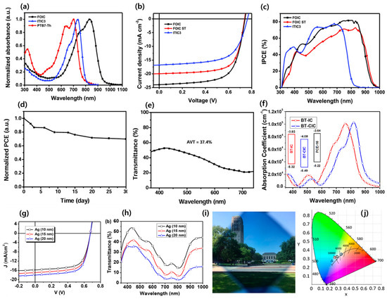 (a) UV-vis. absorption spectra of FOIC, ITIC3, and PTB7-Th in thin film; (b) J–V and (c) IPCE spectra of the best as-cast OSCs and ST-OSCs; (d) air stability of as-cast OSCs without encapsulation based on PTB7-Th: FOIC (1:1.5, w/w), and (e) visible transmission spectrum of the best as-cast ST-OSC. Reproduced with permission [86]. Copyright 2018, John Wiley and Sons. (f) UV–vis absorption spectra of BT-IC and BT-CIC thin films and energy level diagram of BT-IC, BT-CIC, and PCE-10 (inset); (g) J–V and (h) transmission spectra of ST-OSCs device based on PCE-10:BT-CIC (1:1.5, w/w) with different Ag thicknesses; (i) outdoor photograph of ST-OSC using 10 nm Ag thickness, and (j) CIE 1931 color coordinates of the transmission spectra of devices with different Ag thicknesses using a AM1.5G solar simulated input spectrum (denoted by ‘+’), 10 nm thick Ag (‘□’ square), 15 nm Ag (‘○’ circle), and 20 nm Ag (‘△’ triangle). Reproduced with permission [88]. Copyright 2017, American Chemical Society.