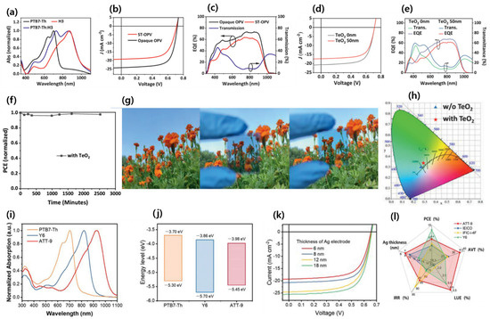 Lee et al. designed and synthesized a series of NIR absorber NFA materials, ITIC-2F, IOTIC-2F, and ITOTIC-2F. The OSC device based on the PTB7-Th:IOTIC-2F blend achieved an outstanding PCE of 12.1% due to nanoscale phase separation and good crystallinity features of NFA molecules. The achieved performance includes a high Jsc of 22 mA cm−2, Voc of 0.82 V, and a notable Eloss of around 0.49 V, despite a very small HOMO offset (∆EH) of only 0.02 eV [76]. In addition, Zou et al. synthesized a fused-ring narrow-bandgap NFA, IE4F-S (also known as IEICS-4F), and the device yielded an efficient PCE of 12.2% with 0.996 V and a notably low Eloss of 0.47 eV when blended with a PTQ10 polymer donor despite the negligible ∆EH [77]. Further, the same group also synthesized and reported a new low-bandgap acceptor, TPT10, and achieved an outstanding PCE of 16.32% with a PTQ11 polymer donor, with an impressive zero ∆EH [78]. These works suggested that small ∆EH is not an essential limitation in realizing the high efficiency of NIR NFA-based solar cells. Yan and co-workers also replaced the alkoxy (OR) group with the alkyl thio (SR) group of IEICO-4F and found that the introduction of alkylthio in IEICS-4F increased the crystallinity and, thus, improved the electron mobility and resulted in a PCE of 7.5% with an AVT of 35% for the ST-OSC binary blend with a PTB7-Th polymer donor [79]. Jia et al. designed and synthesized one of the largest fused cores containing an NFA molecule, namely IUIC. As expected, the fused undecacyclic (11-member rings) exhibited a strong ICT effect between the large π-conjugation core and 2-(5,6-difluoro-3-oxo-2,3-dihydro-1H-inden-1-ylidene)malononitrile (IC-2F), leading to a higher absorption coefficient of 3 × 105 cm−1 and upshifted LUMO energy level of –3.87 eV than ITIC4 (also known as IT-4F and ITIC-4F) (Figure 5a–k). The resonant soft X-ray scattering (R-SoXS) indicated that relative domain purity of the PTB7-Th:IUIC blend, being higher than PTB7-Th:ITIC4 and so minimizing the possibility of bimolecular recombination and facilitating the charge transfer. The ST-OSC device based on the PTB7-Th:IUIC demonstrated an efficient PCE of 10.2%, AVT of 31%, and color coordinate of (0.2231, 0.2870) due to extending absorption in the NIR region and high electron mobility (μe = 1.1 × 10−3 cm2 V−1 s−1). These findings indicate that incorporating larger fused ring core NFA could be an effective strategy in extending the absorption in the NIR region as well as for a performance improvement [80].