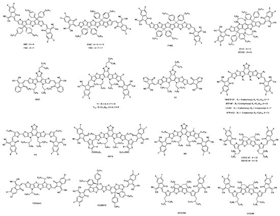 At the beginning of OSC research, a wide-bandgap organic semiconductor material was typically used, and these materials can only use UV and visible light, so the ST-OSC performance based on these materials was found to be unsatisfactory. The Shockley–Queisser (SQ) limit for the PCE of a single-junction opaque OSC is 33.1%, while 20.6% for an ST-OSC with an AVT of 100% [41]. Small molecules emerge as competitively feasible to their polymer counterparts because of several advantages, such as less batch-to-batch variation, easier energy level control, defined molecular weight, and ascertainable structure–property relationships with optoelectronic properties [42,43]. The advent of ITIC- and Y6-based NFA materials in 2015 and 2019, respectively, resulted in rapid progress in fused ring electron acceptors (FREAs) with NIR absorption and offered a new opening to achieve a good balance between the PCE and transparency of ST-OSCs [44,45].