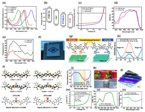 Li and co-workers designed and synthesized a new NIR-absorbing low-bandgap (LBG) NFA ID-4Cl by using a strong electron-withdrawing IC–2Cl acceptor group. The ID-4Cl shows main absorption in the 600–900 nm region due to a strong ICT effect between the IDT core and 2-(5,6-dichloro-3-oxo-2,3-dihydro-1H-inden-1-ylidene)malononitrile (IC-2Cl). The fabricated ST-OSC device with a PM6 polymer yields a PCE of 6.99% with an AVT of 43.7% [67]. Zhao et al. designed and synthesized a new NFA, IT-4F (also known as ITIC-4F), by introducing four fluorine atoms on ITIC. The material showed a downshifted HOMO/LUMO energy level (−5.66/−4.14 eV) compared to their nonfluorinated ITIC counterpart (−5.50/−3.89 eV) (Figure 4a–c). The fabricated OSC device reached an outstanding PCE of 13.1% due to its higher absorption coefficient, strong intermolecular interaction, improved crystallinity, and, hence, facilitated charge transport than nonfluorinated molecule Figure 4d–f [68]. Wu et al. synthesized a new fluorine-containing dialkylthio-substituted polymer, PBN-S, blended with ITIC-4F. Further, 2D grazing incidence wide-angle X-ray scattering (2D-GIWAXS) measurements showed stronger π-π stacking after optimization (1% DIO and thermal annealing) than the as-cast blend, resulting in a higher charge mobility and fill factor. The ST-OSC device demonstrated a PCE of 9.83%, with an AVT of 32% and a notable device stability, retaining around 80% PCE after storage in a nitrogen glove-box for 100 days (Figure 4g–p) [69].