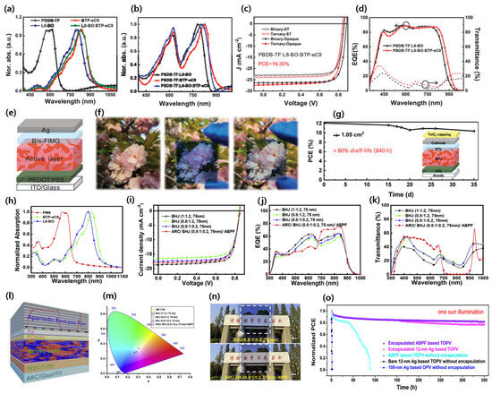 - Li, Y.; He, C.; Zuo, L.; Zhao, F.; Zhan, L.; Li, X.; Xia, R.; Yip, H.; Li, C.; Liu, X. High-performance Semi-transparent Organic Photovoltaic Devices via Improving Absorbing Selectivity. Adv. Energy Mater. 2021, 11, 2003408. [Google Scholar] [CrossRef]
