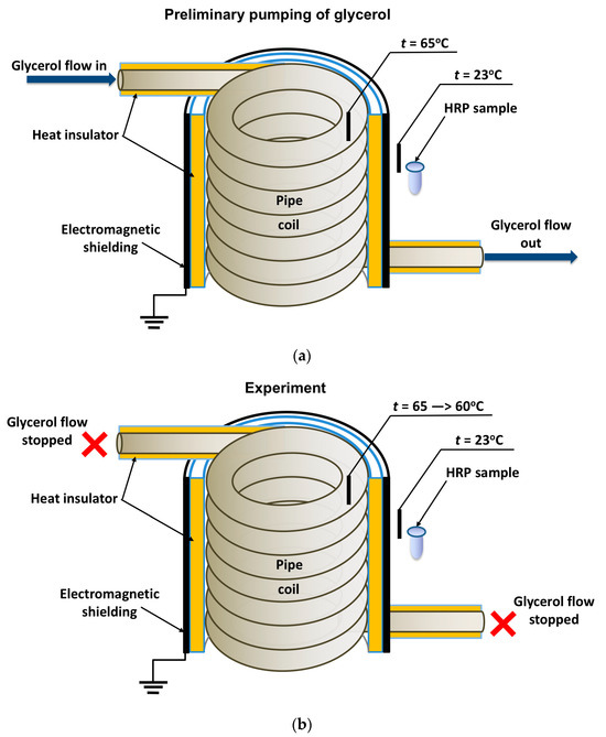 In general, the experimental setup was similar to that used in our previous study [19], but the enzyme was incubated near the heat exchanger’s coiled section. The location of the tested HRP solution (working sample) is schematically shown in Figure 1.