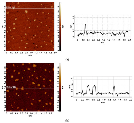 The curves shown in Figure 3 indicate that for the control enzyme sample, the maximum of the respective density function corresponds to hmax(control) = 1.0 ± 0.2 nm, while its width at half-height (WHH [44]) makes up WHH(control) = 0.5 nm. As was mentioned above, the height of AFM images of monomeric HRP is 1.0 to 1.2 nm. Accordingly, objects of this height observed on the mica surface can be attributed to HRP monomers.