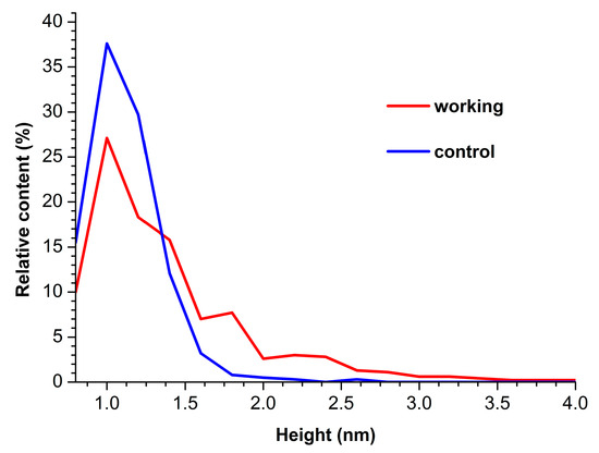 For the working enzyme sample, the maximum of the respective density function was similar to that observed for the control one: hmax(working) = 1.0 ± 0.2 nm. At that, the distribution obtained for the working sample was considerably broader: WHH(working) = 0.7 nm. The broader ρ(h) distribution obtained for the working sample indicates an increased aggregation of HRP in it—as compared with the control sample. The higher objects should be attributed to aggregated enzymes [20]. Furthermore, an increased contribution of particles with heights > 1.4 nm was observed in comparison to the control sample, and this is the second fact indicating increased aggregation of HRP.