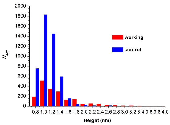 Figure 4 displays histograms of absolute number of AFM-visualized particles, normalized per 400 µm2 (N400), plotted vs. height.