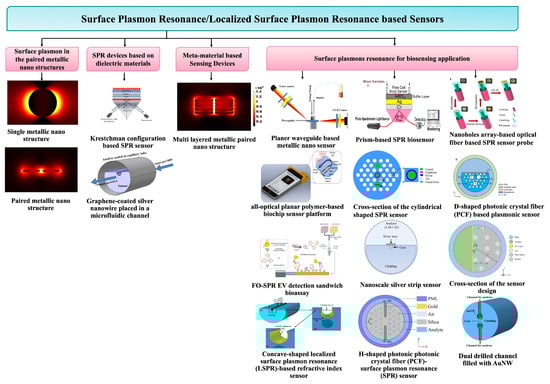 Surface plasmons, continuous and cumulative electron vibrations confined to metal-dielectric interfaces, play a pivotal role in aggregating optical fields and energies on nanostructures. This confinement exploits the intrinsic subwavelength nature of their spatial profile, significantly enhancing light–matter interactions. Metals, semiconductors, and 2D materials exhibit plasmonic resonances at diverse wavelengths, spanning from ultraviolet (UV) to far infrared, dictated by their unique properties and structures. Surface plasmons offer a platform for various light–matter interaction mechanisms, capitalizing on the orders-of-magnitude enhancement of the electromagnetic field within plasmonic structures. This enhancement has been substantiated through theoretical, computational, and experimental studies. In this comprehensive review, we delve into the plasmon-enhanced processes on metallic and metamaterial-based sensors, considering factors such as geometrical influences, resonating wavelengths, chemical properties, and computational methods. Our exploration extends to practical applications, encompassing localized surface plasmon resonance (LSPR)-based planar waveguides, polymer-based biochip sensors, and LSPR-based fiber sensors. Ultimately, we aim to provide insights and guidelines for the development of next-generation, high-performance plasmonic technological devices.