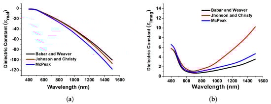 Figure 3 depicts the computed real and imaginary components of the dielectric permittivity for gold, which have been used to compute the reflection and transmission coefficients. Figure 3 demonstrates the relationship between the actual dielectric permittivity and the wavelengths. Its value decreases across the UV region until it becomes negative in the visible range and remains mostly negative in the infrared spectrum. This electromagnetic feature of the actual dielectric permittivity is responsible for the diverse optical activity of metals, such as the presence of surface plasmon resonance. Resonances are charged particle vibrations inside the atmosphere. Here, in Figure 3, datasets have been collected from Babar and Weaver [], Johnson and Christy [], and McPeak [] for achieving accurate and strong resonance. Furthermore, we have implemented the model in COMSOL Multiphysics by importing these datasets.
