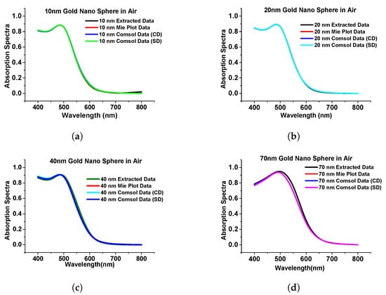 Comparison of simulated results with published work. (a) The absorption spectra of gold nanosphere of 10 nm radius. (b) Absorption spectra of gold nanosphere of 20 nm radius. (c) Absorption spectra of gold nanosphere of 40 nm radius. (d) Absorption spectra of gold nanosphere of 70 nm radius. Original results from [].