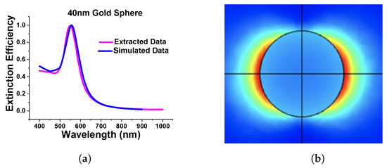 Comparison of simulated and extracted from []. (a) Extinction efficiency of stand-alone gold nanosphere of 40 nm diameter in water. (b) Simulated normalized electric field of nanosphere.