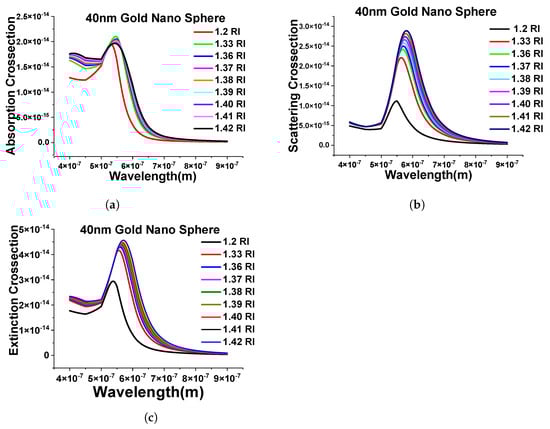 Next, we have extended the above-shown results with the evaluation of the performance of different surrounding mediums (from RI 1.2 to 1.42) and simulated the designed FEM model to calculate the absorption cross-section shown in Figure 6a. Here, it can be seen that as the refractive index of the surrounding media is changing, the spectra are shifting toward the higher wavelength, and, similar patterns can be seen while calculating the scattering and extinction cross-section, as shown in Figure 6b,c.