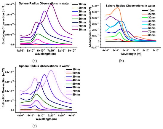 Furthermore, the effect of the structural geometries of the nanosphere was calculated. To study the structural effect of the nanosphere, the dimension of the nanostructure was changed from 10 nm to 80 nm. In this case, we started from 10 nm radius to 80 nm with a 10 nm step size and calculated the scattering, absorption, and extinction efficiencies, which are shown in Figure 7a–c, respectively.