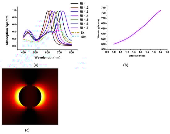 Figure 8a shows the absorption spectra of the gold nanodisk of 80 nm diameter and surrounding refractive index varied from 1.0 to 1.7. The performance of the developed model was compared with the published experimental and simulation spectra shown by dashed orange and sky blue curves, respectively. From this, it can be stated that when the refractive index of the surrounding media was close to 1.4; in that case, our simulated results agree well with the published work. From these findings, we have benchmarked our modelling works and extended them to visualize the plasmonic wavelength shift, which is plotted concerning the refractive index variation of the surrounding medium, as shown in Figure 8b. From this figure, it can be concluded that the wavelength shift follows a linear pattern when the refractive index changes in the surrounding media. Additionally, Figure 8c shows the electric field distribution of the gold nanodisk along the plane.