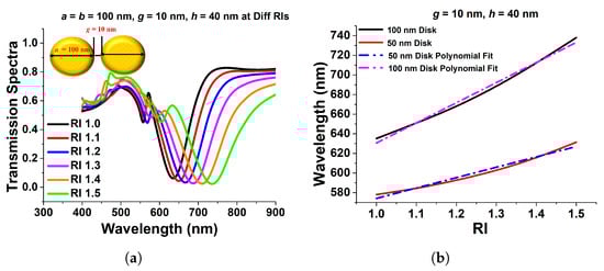Since it is usually recognized that paired nanostructures could increase the field intensity across their gaps, in this section, we will discuss the effect of the paired circular and elliptical disks on the surface plasmon resonance. As a result, the transmission spectra of a 100 nm gold nanodisk surrounded by a material with varied refractive indices are displayed in Figure 9a. One can see that when the refractive index increases, the resonating wavelength shifts to a higher wavelength. The separation gap, g, and the height of the disks, h, are set to 40 nm and 10 nm, respectively. The resonating wavelength increases when the surrounding refractive index, RI, is increased, as shown in Figure 9b. The slopes of these two curves are 105.79 and 205.18, for diameters 50 nm and 100 nm, respectively, which are used to compute the sensitivities of the coupled circular nanodisks. A nearly linear relationship between wavelength fluctuations and RI variations has also been demonstrated. For 50 nm and 100 nm diameters, the R-square errors were estimated as 0.98915 and 0.9137, respectively, indicating a nearly linear correlation. The acquired sensitivity of the 100 nm coupled disk is bigger than that of the 50 nm paired disk, as illustrated in Figure 9b.