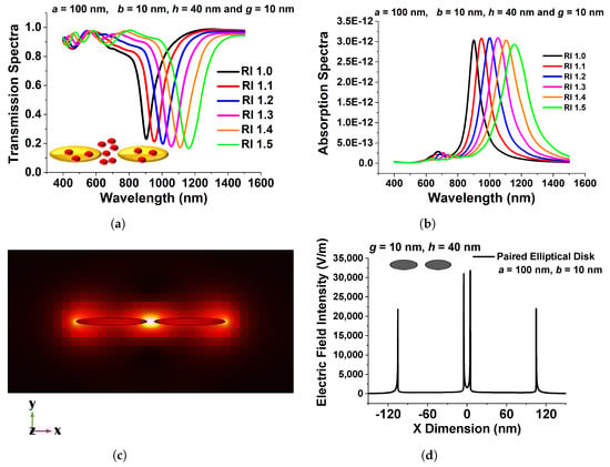 Figure 10b illustrates the absorption spectra of the developed coupled nanoantenna array for six RI values, which validates the observed transmission spectra and demonstrates sensing responses. The resulting electric field intensity in the separation region and extremely high electric field containment in the centre of the coupled antenna is shown in Figure 10c. The intensity of the localized electric field is critical for label-free identification. Because the highest electric field is developed at the centre of the separation gap in the designed structure, such an ultra-strong electric field can be used for sensing applications. Figure 10d depicts the variation of the electric field in the x direction across the centre of the elliptical antenna pair. Although electron conduction provides an efficient force at the surface of the paired device, the electric field in the separation gap region is significantly enhanced, as shown in Figure 10d. The maximum normalized electric field, shown by a black curve in Figure 10d, reaches up to 35,000 V/m at the inward edge of the paired elliptical disk for a = 100 nm, b = 10 nm, g = 10 nm, and h = 40 nm, indicating that the highest field intensity is more than 50% greater in the gap, especially in comparison to the field at the outer edges. It can be regarded as a superior choice for biosensor applications owing to its increased strength of electric field containment. The applied electric field profile shows that by reducing the minor axis, a considerable field increase may be observed at the sharp corner of a coupled structure. This coupling causes the LSPR improvement because the elliptical structures interact more strongly as they approach closer to one another. When the separation distance was larger, the change in transmission and absorption spectra of the resonating wavelength was smaller; therefore, a smaller separation distance is recommended to generate an intense electric field concentration. The maximum localized field intensity forms due to the coupling of surface waves on nanostructures, as shown in the aforementioned figures, and could be an ideal contender for RI sensing applications.
