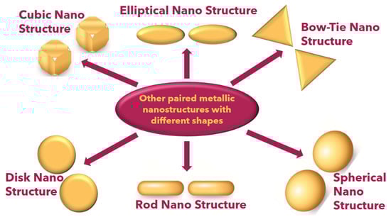 In Figure 11, a comprehensive depiction of diverse paired gold nanostructures is presented, showcasing their unique characteristics based on localized surface plasmon resonance (LSPR). The intricate interplay between the localized electromagnetic fields and the morphology of these paired gold nanostructures is evident in Figure 11, offering a visual representation of the fascinating diversity within this class of nanomaterials. Researchers in the field can glean insights into the nuanced optical responses of these nanostructures, facilitating a deeper understanding of their potential applications and paving the way for advancements in fields such as biomedical sensing, catalysis, and optoelectronics. Table 1 shows the various nanoparticles and their characteristics in various applications.
