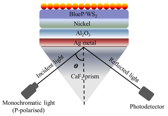 - Alotaibi, M.F.; Al-Hadeethi, Y.; Lohia, P.; Singh, S.; Dwivedi, D.K.; Umar, A.; Alzayed, H.M.; Algadi, H.; Baskoutas, S. Numerical study to enhance the sensitivity of a surface plasmon resonance sensor with BlueP/WS2-covered Al2O3-nickel nanofilms. Nanomaterials 2022, 12, 2205. [Google Scholar] [CrossRef] [PubMed]