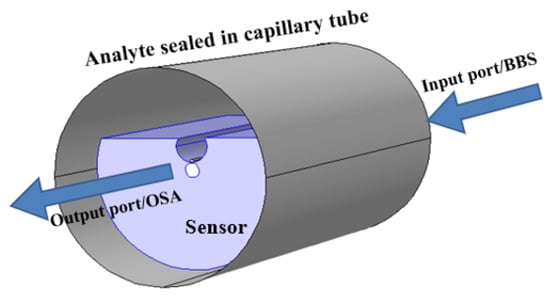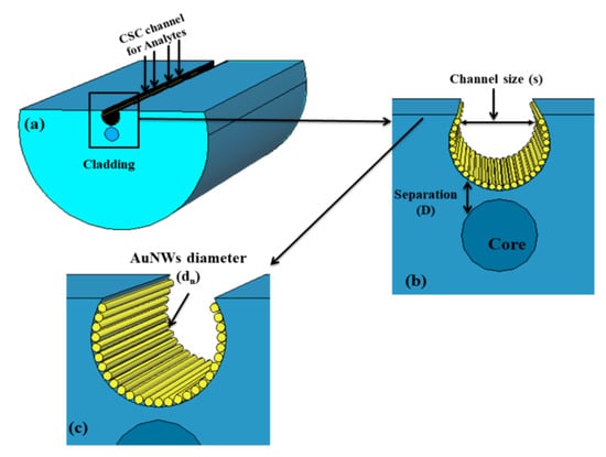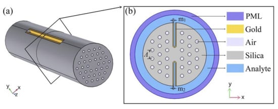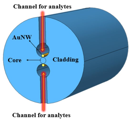 The demand for contemporary biomedical care and the importance of physical tests are both rising along with the improvement in living standards. Early intervention and treatment of diseases via physical examination are expected to yield better results. The primary task of achieving this goal is the detection of biomarkers related to various diseases. Several optical plasmonic-based biosensors have been demonstrated in past decades to achieve the goal of real-time detection of biomolecules, proteins, and viruses [,]. These plasmonic sensors can be categorized based on the location of the metal deposition and are hence known as external and internal sensing []. In the case of external sensing, the plasmonic layer and analytes remain outside the fiber, e.g., D-shaped, etched, U-bent fibers, etc. [], whereas in internal sensing, all these arrangements remain inside the substrate, such as metal-deposited photonic crystal fiber.