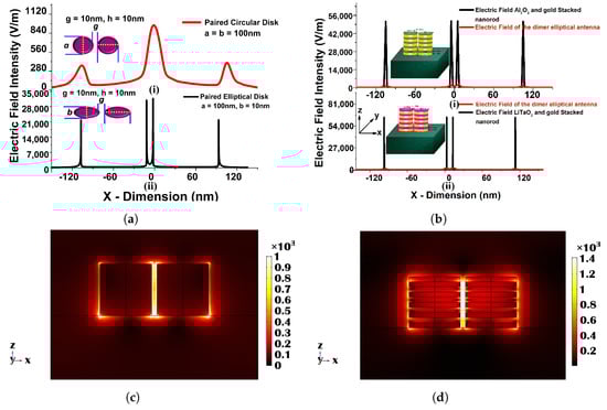 (a) Electric field distribution along the x-plane in the (i) circular paired when = 100 nm, g = 10 nm, and h = 10 and (ii) gold elliptical structure when a = 100 nm, b = 10, g = 10 nm, and h = 10. (b) Electric field distribution along the x-plane in the single gold and stacked 10 layers (with (i) or (ii) ) elliptical paired structure when a = 100 nm, b = 10, g = 10 nm, and = = 10 nm. (c) , mode field profile of a single metallic elliptical nanostructure when a = 100 nm, b = 10 nm, and h = 100 nm along the x–z plane. (d) Electric field variation along the x–z plane for a 10 layered stacked nanostructure when a = 100 nm, b = 10 nm, and = = 10 nm [].
