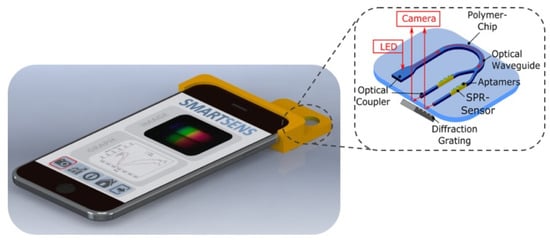 In 2020, Walter et al. reported an all-optical SPR sensor designed for smartphones based on planar-optical waveguide configuration integrated into a polymer chip, as shown in Figure 16 []. The sensor system’s applicability for biosensing purposes was demonstrated by detecting 25-hydroxyvitamin D (25OHD) in human serum samples using an AuNP-enhanced aptamer-based assay. The fabricated assay exhibited a good sensitivity of 0.752 pixel/nM for 25OHD concentrations varying from 0 to 100 nM. The sensor’s waveguide structure enabled miniaturization and parallelization, showcasing the potential for the simultaneous detection of various analytes, including biomarkers. The entire optical arrangement could be integrated into a single polymer chip, allowing for large-scale and cost-efficient sensor fabrication. The reported sensor was highly attractive for wider use in lab-on-chip applications due to the broad utilization and accessibility of smartphone electronics.