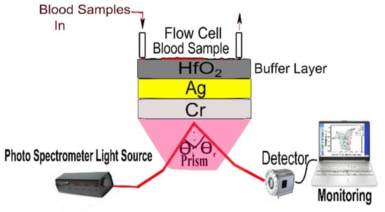 In 2023, Pandey et al. reported the potential of chromium (Cr), silver (Ag), and hafnium oxide () as an SPR biosensor for precise blood-group identification []. In the reported work, the author utilized a buffer layer on top of SPR active metal to avoid oxidation and contamination of blood samples, as shown in Figure 17. This study developed a theoretical model using experimental data, taking into account the refractive index of blood samples. The research identifies the BK7 prism as the ideal substrate material for precise blood type identification analysis when utilizing a combination of Ag and Cr as the active SPR metals. The sensor’s performance is thoroughly examined, considering an angular shift, curve width, and other design aspects crucial for accurate blood group identification. Additionally, the study explores the SPR dip slope, detection accuracy, and the figure of merit (FOM) to enhance the potential for future biosensor applications.