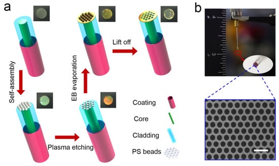 (a) Schematic of the bottom-up fabrication procedure for nanohole array-based optical fiber probe. (b) A photograph of the optical fiber sensing probe. Reprinted/adopted from [].