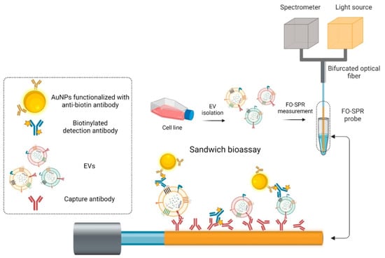 Schematic of the different steps from the FO-SPR EV detection sandwich bioassay. Reprinted/adopted from [].