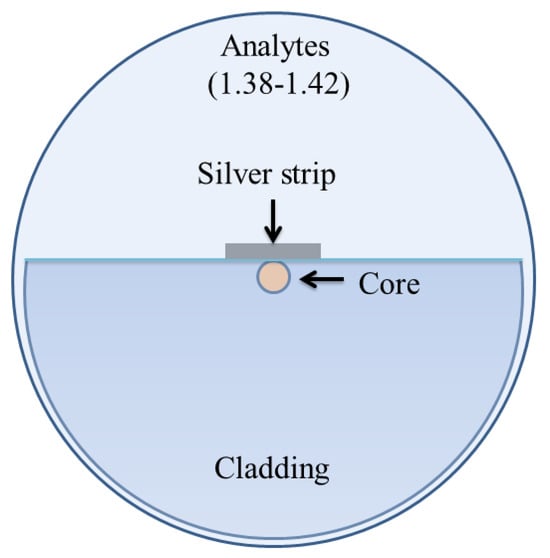 A plasmonic optical fiber-based sensor generally relies on the phase-matching conditions that take place between the surface plasmon polariton (SPP) and the guided mode, commonly known as the SPR condition [,]. This phenomenon occurs when the wave vector of the optical propagating wave within the fiber aligns with the propagation constant of SPP. This alignment is highly sensitive toward changes in the surrounding medium. Furthermore, when photons excite the metal–dielectric interface, they generate surface plasmons. During the resonance condition, the surface plasmon waves (SPW) at the metal interface predominantly extract energy from the optical wave photons at a specific wavelength, resulting in a maximum loss of the optical wave as it propagates. Consequently, the variation in the surrounding environment leads to changes in the resonance wavelength, facilitating sensitive sensing. The sensitivity of this sensor is quantified as the ratio between the change in refractive index and the corresponding shift in resonance wavelength. In recent years, several optical fiber-based SPR biosensors with outstanding performance have been documented in the scientific literature [,,].
