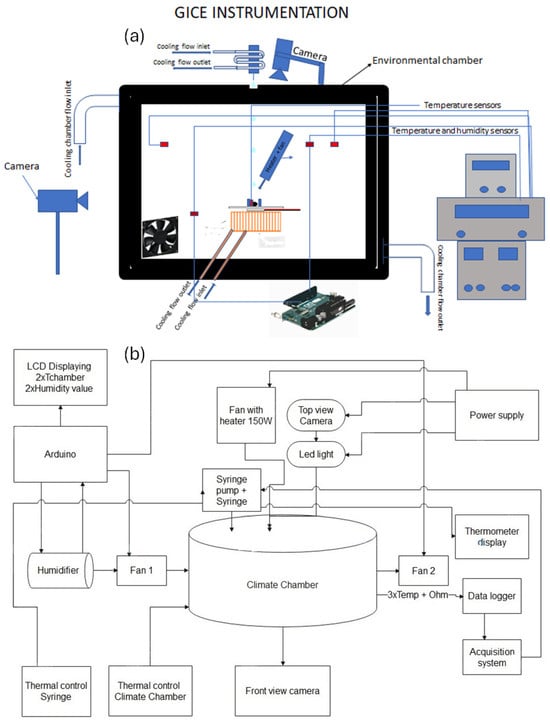 (a) Diagram of the setup. The environmental chamber is depicted with the main components. (b) A schematic of the climate chamber setup used for the ice detection experiments, featuring an Arduino-based control system, humidity and temperature regulation, and real-time monitoring capabilities via cameras and sensors.